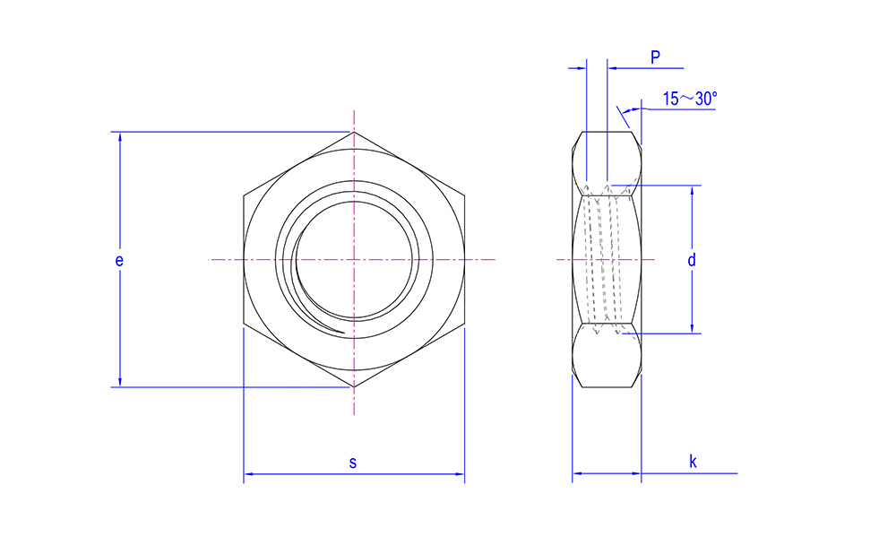 | Utseendeegenskaper | Form: Sekskantet med seks symmetriske sider, noe som gjør det enkelt å stramme og fjerne med en skiftenøkkel eller annet verktøy. Denne utformingen gir bedre betjeningskomfort i trange rom. Tykkelse: Sammenlignet med standard sekskantmutter er den tynnere, klassifisert som en tynn mutter. Den er relativt lett og tar mindre plass. Overflatebehandling: Beholder vanligvis den naturlige rustfrie stålfargen med en metallisk glans. Den kan også gjennomgå passivering, polering eller andre overflatebehandlinger etter behov for å forbedre korrosjonsbestandigheten og estetikken. |