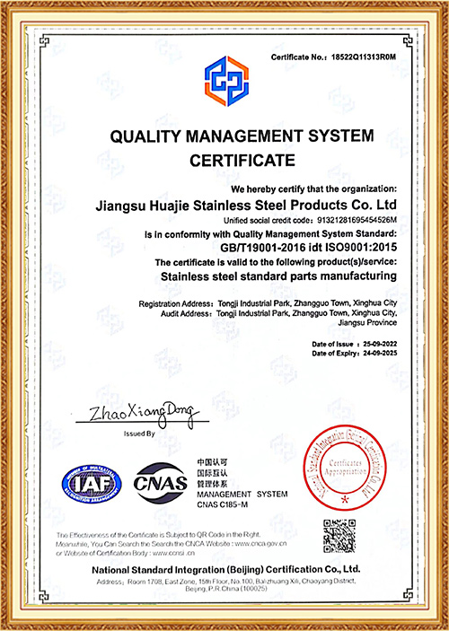Hos Jiangsu Huajie Stainless Steel Products Co., Ltd. setter vi vår ære i å levere festemidler i toppklassen som ikke bare oppfyller, men overgår internasjonale standarder. Vår forpliktelse til innovasjon, kvalitetssikring og kundestøtte gjør oss til en pålitelig partner for bransjer som krever fortreffelighet innen festeløsninger.